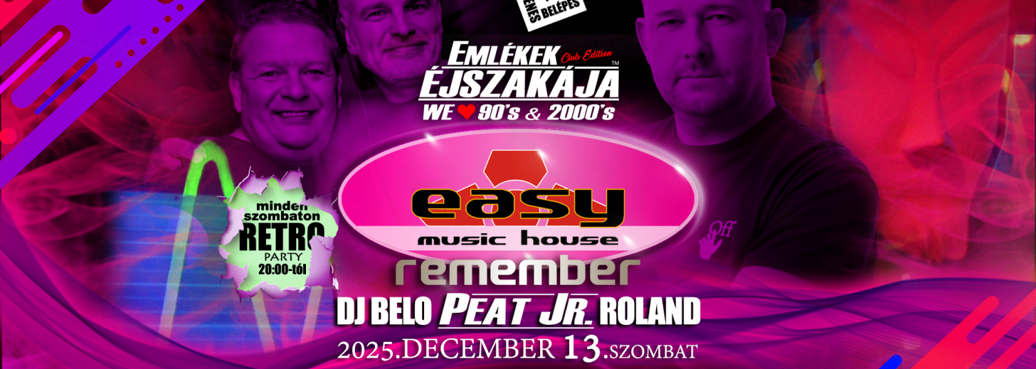 2025.december 13. szombat Easy Music House Remember X Emlékek éjszakája Minden szombaton, 20:00-tól No1 RETRO party A 21:30-ig megvásárolt jegyek értéke 23:00-ig ételre vagy italra levásárolható. Program: 20:00 Dj Dorian RETRO buli 23:00 Dj Belo 00:30 Peat Jr. 01:30 Dj Roland Egész éjjel működő szolgáltatások: - Bowling - Biliárd - Snooker - Darts - Csocso KONHYA INFO: Konyha nyitvatartás: 23:00-ig ITALAKCIÓ: WhiskeyCola: 1.850 Ft ( Johnnie Walker ) RumCola: 1.850 Ft ( Bacardi ) VodkaNarancs: 1.850 Ft ( Kalinka ) GinTonic: 1.850 Ft ( Tanqueray ) JEGY INFO: A No1 Szalon eseményeire elővételben, kedvezményes áron is tud jegyet váltani. Az elővételes jegyek megvásárolhatók online, bankkártyával, minden nap 11:00-tól 22:00-ig óráig a www.no1szalon.hu oldalon, vagy személyesen, készpénzzel a No1 nyitvatartási idejében. Elővételes jegyek a rendezvényt 2025.december 9-ig kaphatók. Ezt követően a jegyek a helyszínen kaphatók. A No1 Szalon eseményeire online megvásárolt jegyeket kizárólag csak a bank által kiszabott költségek terhelik. Egyéb költséget nem számítunk fel. Kérjük, kiemelten ügyeljen e-mail címének pontos megadására. Vásárlásnál válassza az "elvitel" vásárlási módot és az "online bankkártya" fizetést! A vásárlást követően automata e-mailben igazoljuk vissza a vásárlás sikerességét. Jegyfoglalás nem lehetséges. Kizárólag előre kifizetett, befejezett tranzakció tekinthető vásárlásnak. A megvásárolt jegyeket legkésőbb a rendezvényt megelőző 48 órán belül, a megadott e-mail címre küldjük. Addig is csatlakozz az eseményhez, hogy ne maradj le az elővételes jegyekről. Jegylink: https://no1szalon.hu/jegyelovetel Jegyárak: Elővétel: 1.500Ft Helyszíni: 2.500 Ft A 21:30-ig megvásárolt jegyek értéke 23:00-ig ételre vagy italra levásárolható. TOVÁBBI INFO: A jegyvásárlás asztalfoglalást nem biztosít. Ülőhely igény esetén asztalfoglalás szükséges. Asztalfoglalás megvásárolt jegy esetén lehetséges. Asztalfoglalás: 06 20 477 5505 Cím: 8360. Keszthely, Georgikon utca 23. Telefon: 06 20 477 5505